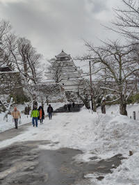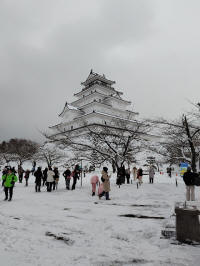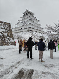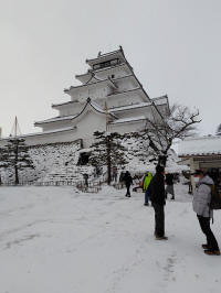 午前中、鶴ヶ城見学、こちらも雪の中、天守閣まで行く。